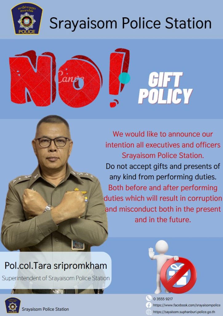 - ประกาศสำนักงานยุทธศาสตร์ตำรวจเรื่องเจตนารมณ์ที่จะไม่รับของขวัญหรือของกำนัลทุกชนิดจากการปฏิบัติหน้าที่